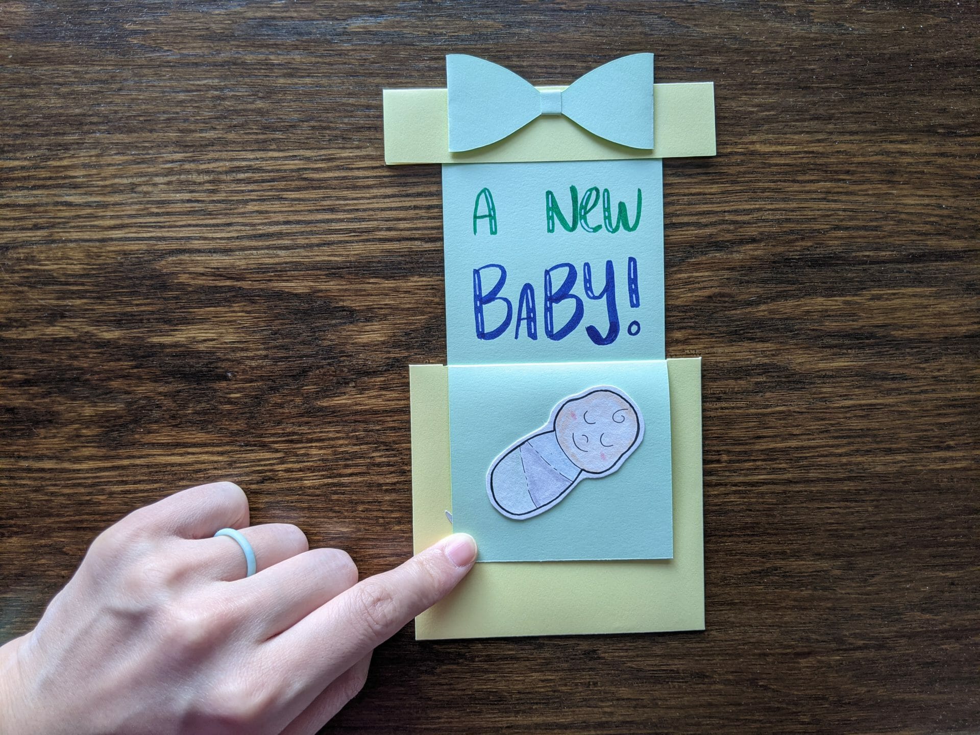 OMG! A new baby! This handmade card can both be given to expecting parents or can be given as a surprise card for family and friends! Inspired from the suspense of opening a present. Card comes along with a self sealing envelope.